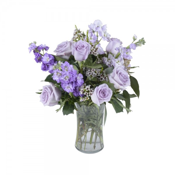 De magnifiques fleurs couleurs lavande tel des roses, du giroflé avec un magnifique accompagné le tout dans un vase clair très délicat.