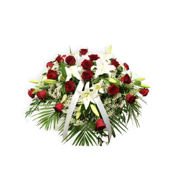 Ce splendide coussin composé de magnifique rose rouge ainsi que de lys blanc pur saura accompagner le cercueuil de la personne chère de façon élégante et solonnelle.