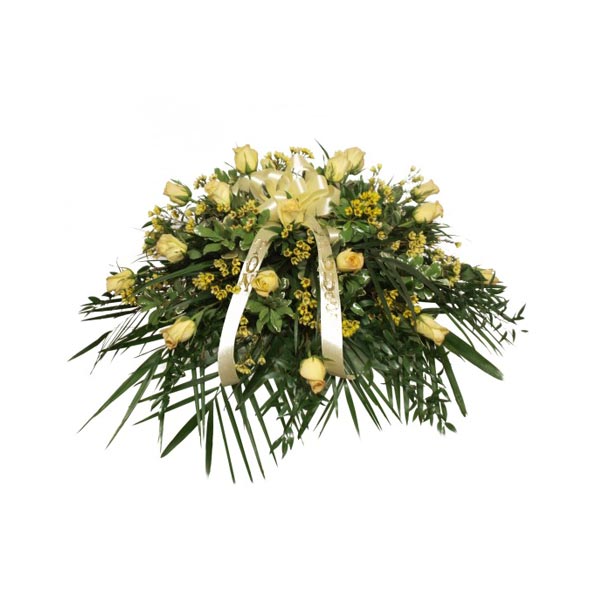 Ce doux coussin de cercueil composé de roses couleurs crème, de wax jaune et d'une ravissante verdure, dégage grâce et innocence.