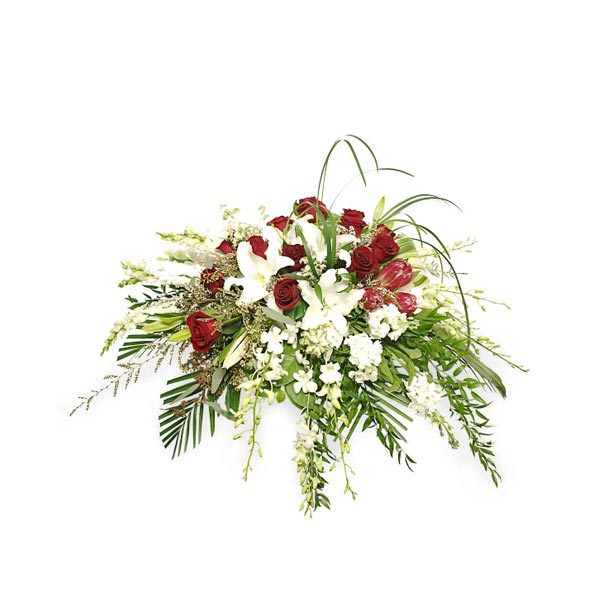Ce coussin comprenant de lys blanc, de mufflier blanc, de dendrobium blanc avec une délicate touche de magnifique rose rouge. Il apportera richesse et élégance au cercueil.