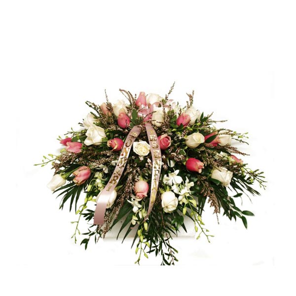 Pour commémorer la mémoire d'un être cher, déposez ce magnifique coussin de fleurs avec des roses rose, des roses blanches ainsi que des orchidées dendrobium blanc directement sur le cercueil.